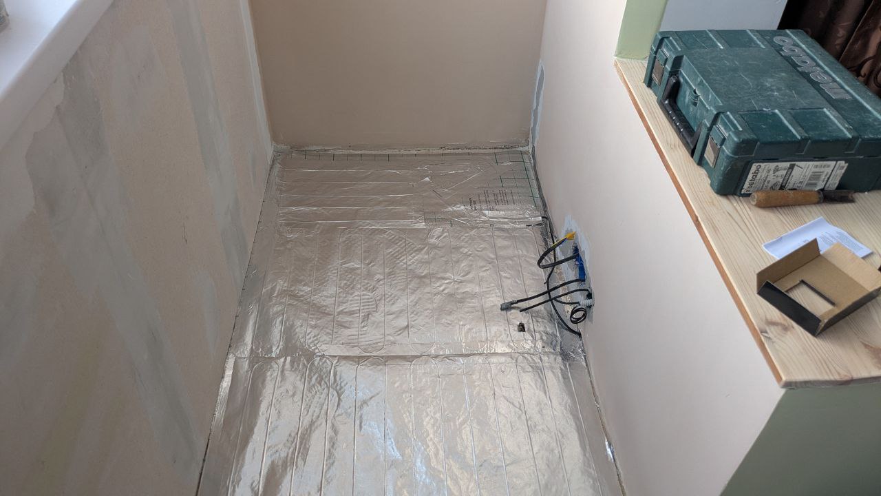 Именно поэтому нашим инженером был рекомендован ультратонкий фольгированный тёплый пол Grandex MF — один из лучших вариантов для балконов, лоджий, небольших помещений и зон с ограничением по высоте стяжки.