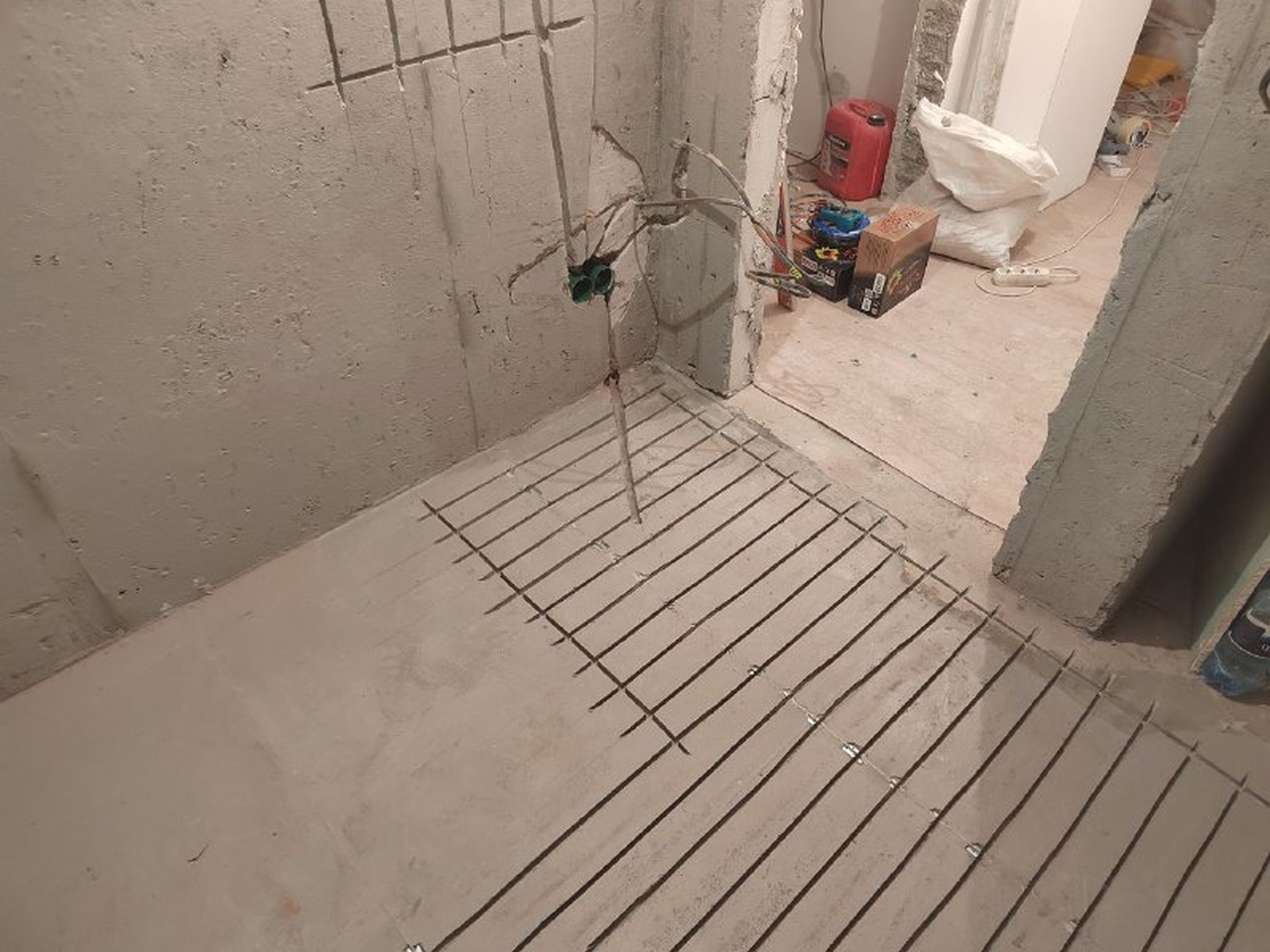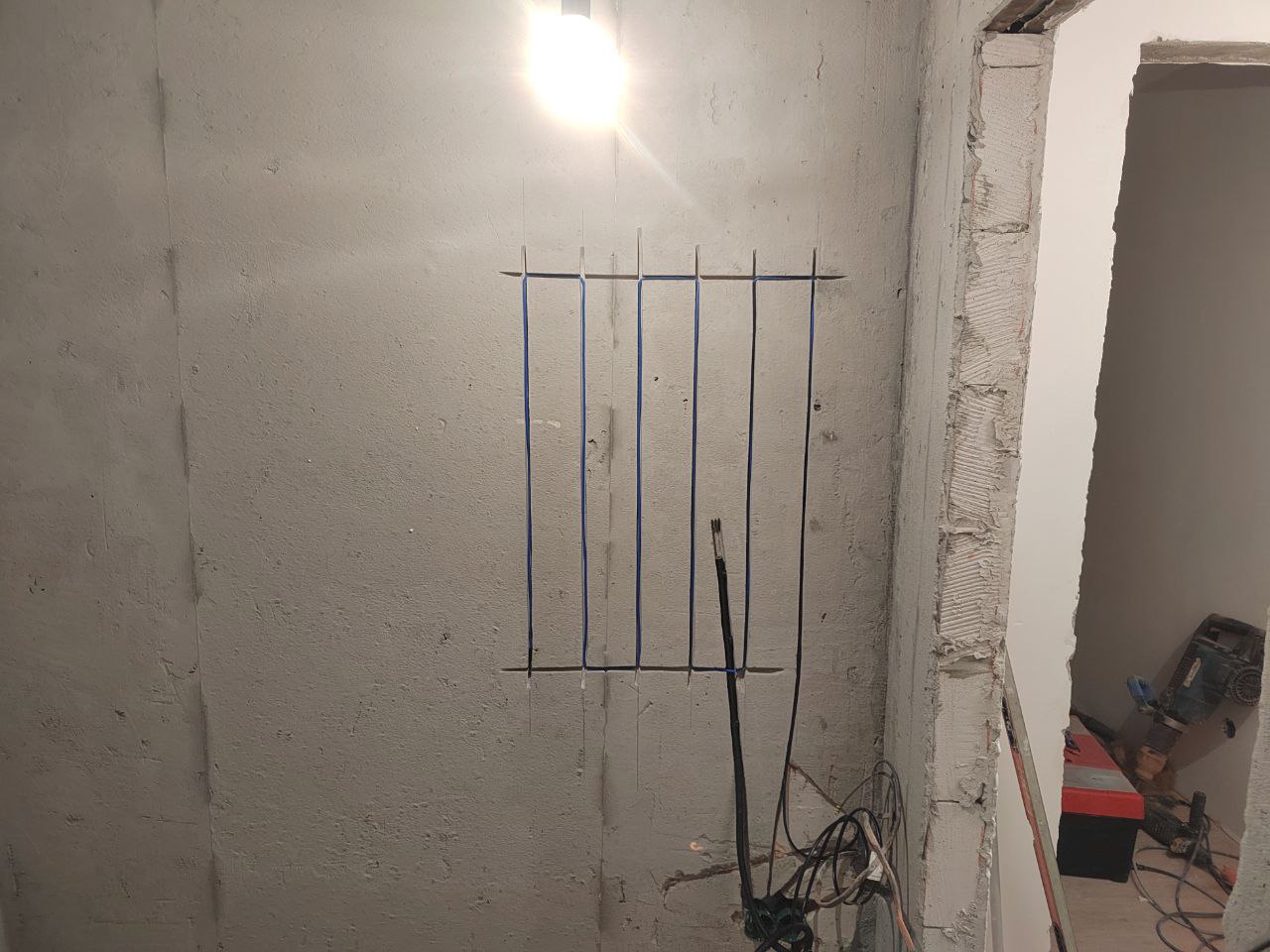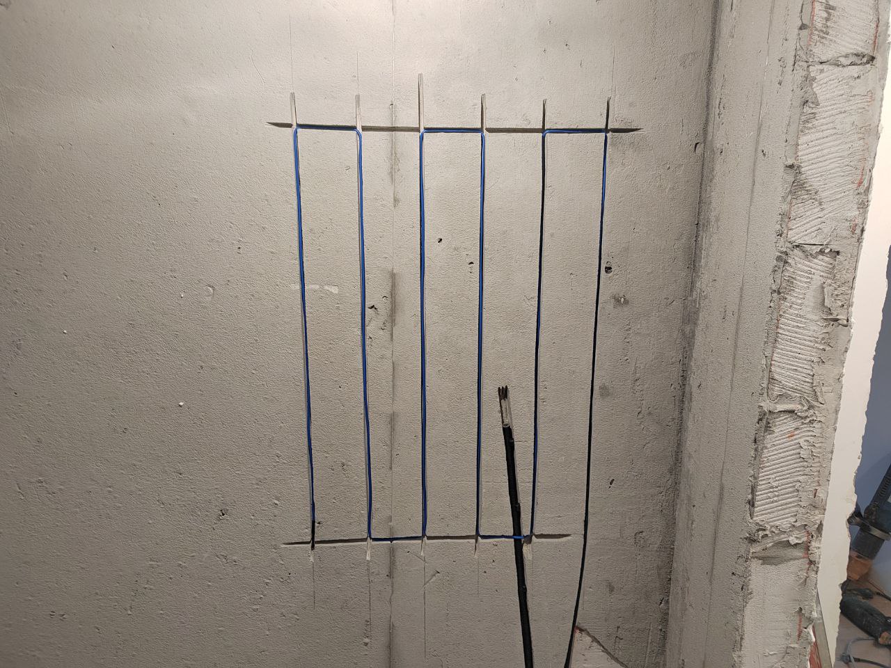 Для корректной работы терморегулятора также были подготовлены штробы под датчики температуры пола. Такой подход обеспечивает точную регулировку и оптимальный расход электроэнергии.