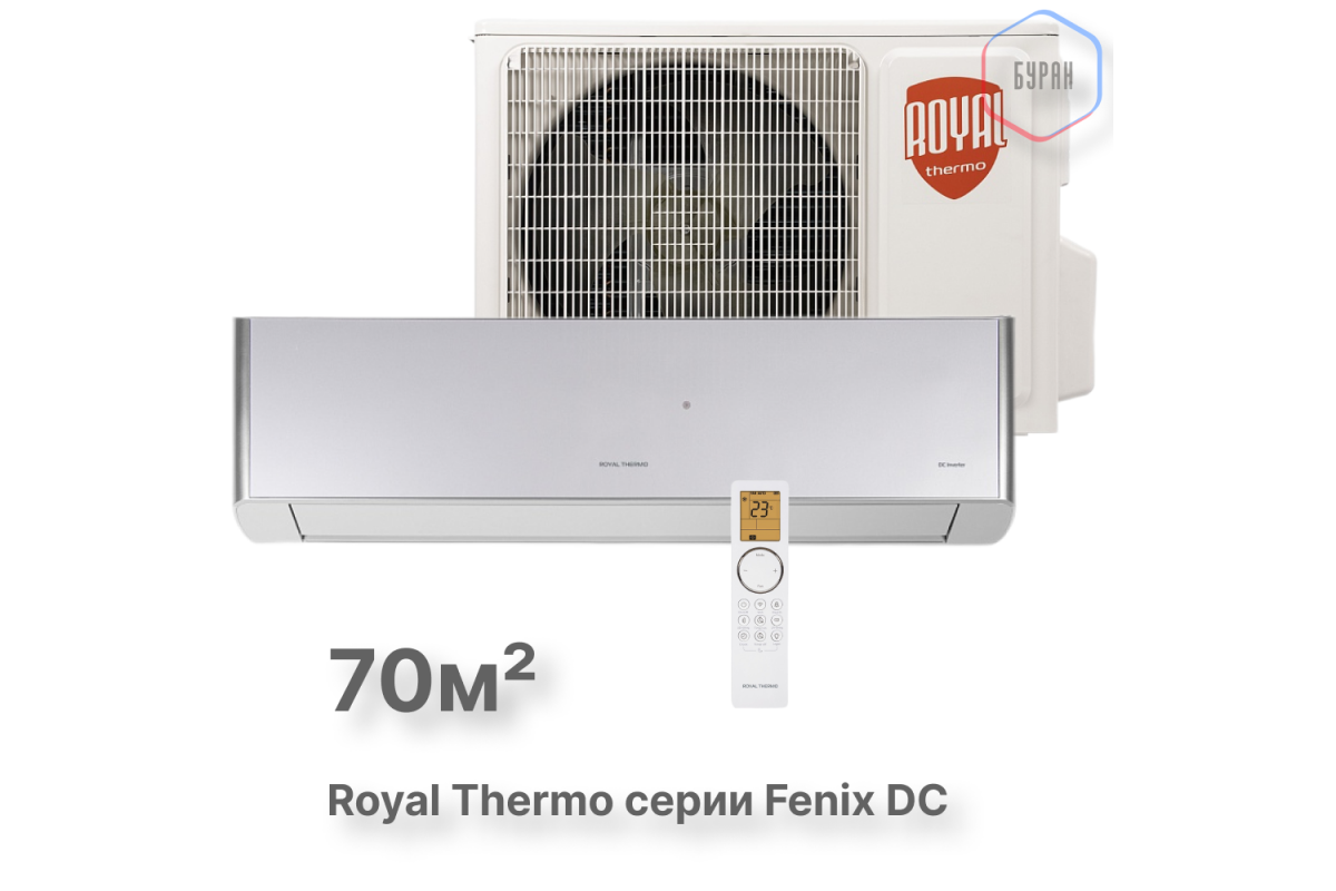 Сплит-система инверторного типа Royal Thermo Fenix DC RTFI-24HN8/silver комплект идеально подходит для помещений площадью до 70 м². Это делает его отличным выбором для квартир, офисов или небольших домов. 🏠