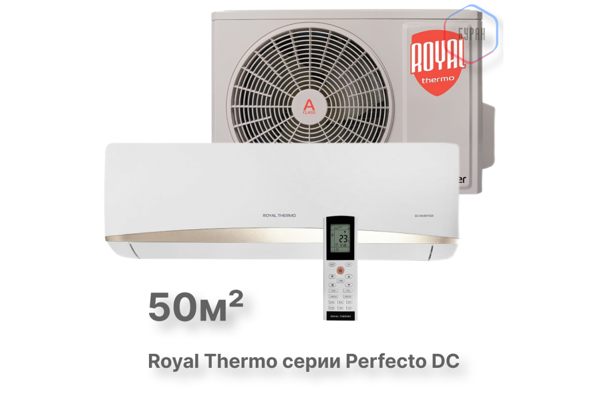 Сплит-система инверторного типа Royal Thermo Perfecto DC RTPI-18HN8 комплект идеально подходит для помещений площадью до 50 м², обеспечивая эффективное охлаждение и обогрев. Это отличный выбор для спальни, кабинета или небольшой гостиной. ​